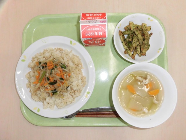 献立は、ビビンバ、青のりのフライドポテト、鶏と冬瓜のスープ、牛乳です。