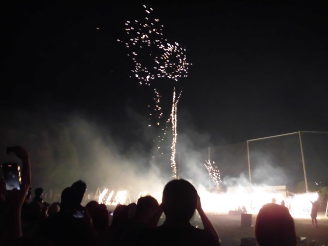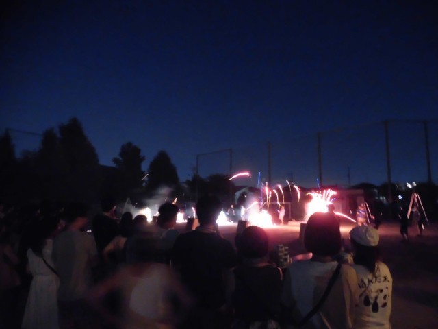 暗くなったら打ち上げ花火の開始です。「火文字」や「ナイアガラ」など、おもしろかったり、迫力満点だったり、とても楽しみました。