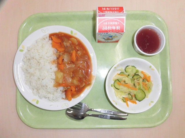 ハッシュドポークライスは、トマト味でおいしかったです。3年生からも「気絶しそうなくらいおいしい」「来月のメニューにも入れてもらいたい」という声がありました。