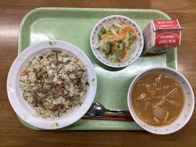 今日の献立は、鶏肉とごぼうのごはん、えだまめ入りサラダ、呉汁、牛乳です。