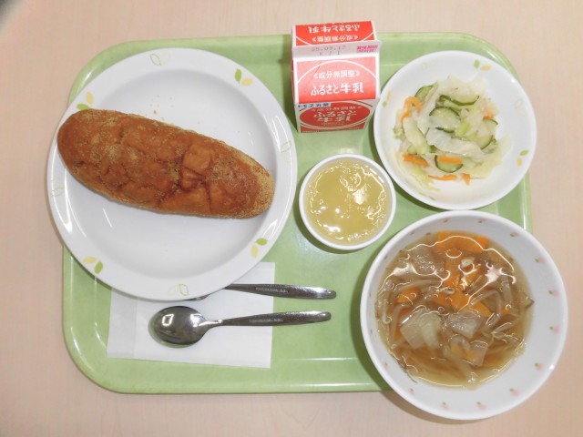 献立は、きなこあげパン、フレンチサラダ、春雨スープ、フルーツゼリー、牛乳です。