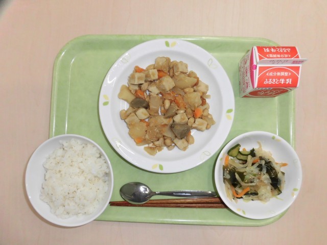 献立は、麦ごはん、豆入り筑前煮、わかめサラダ、牛乳です。