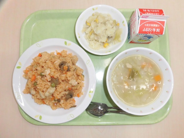 献立は、チキンライス、コーンポテト、ABCスープ、牛乳です。