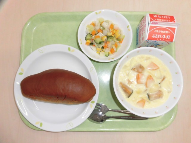 献立は、黒砂糖パン、パンプキンシチュー、コーン入りサラダ、牛乳です。