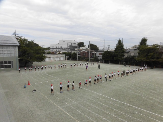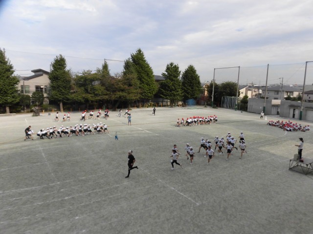 写真は、高学年の団体競技と、選抜リレーの練習の様子です。