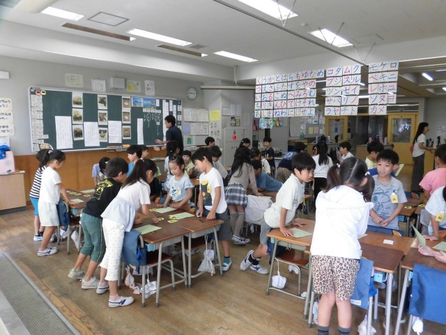 写真右は1組の様子です。「うみのかくれんぼ」は説明文なので、本文の中から「問い」の文と「答え」の文を探しています。