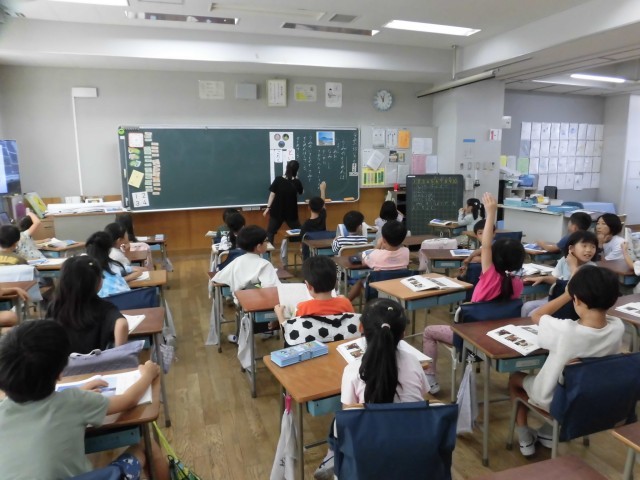 写真左は3組の様子です。「うみのかくれんぼ」を読んだ感想を、班の友達と読み合っています。