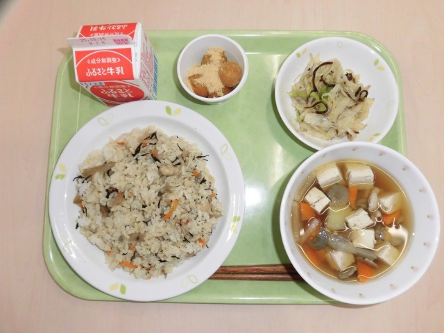 献立は、五目ごはん、けんちん汁、もやしの塩昆布かけ、月見だんご、牛乳です。