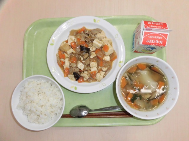 献立は、麦ごはん、家常豆腐、ワンタンスープ、牛乳です。