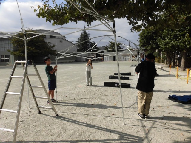 写真は、校庭の遊具に囲いをしているところ、得点板を掲示しているところ、テントを組み立てているところです。