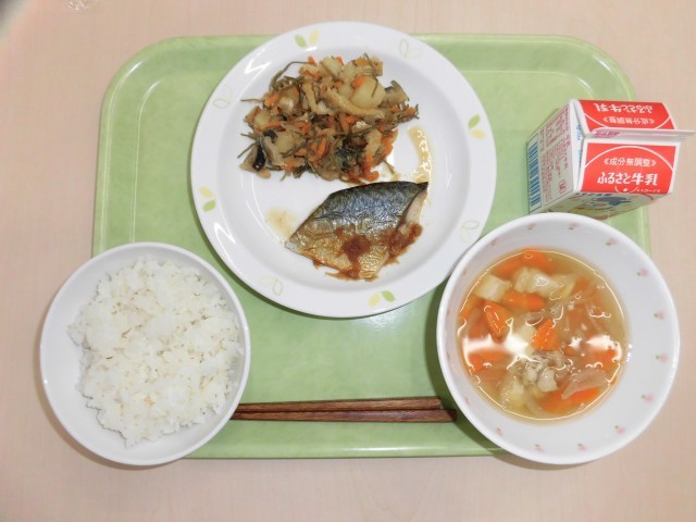献立は、麦ごはん、魚のしょうが風味焼き、きざみこんぶの五目煮、吉野汁、牛乳です。
