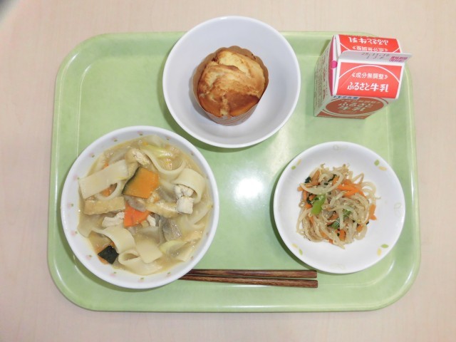 献立は、ほうとう、もやしのごまあえ、りんごマフィン、牛乳です。