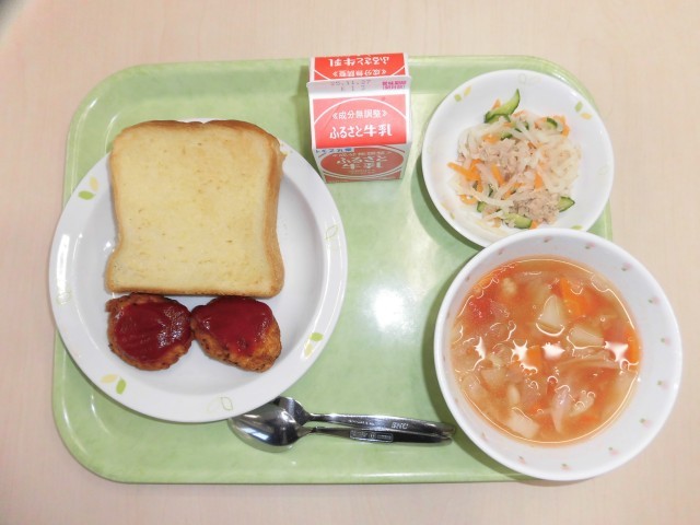 献立は、バタートースト、豆腐のチキンナゲット、大根のツナサラダ、白いんげん豆のトマトスープ、牛乳です。