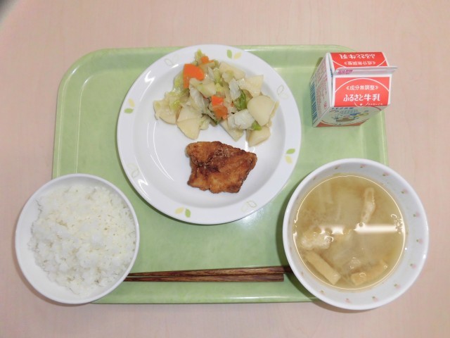 献立は、有機米ごはん、鶏肉のから揚げ、和風ポテトサラダ、大根のみそ汁、牛乳です。