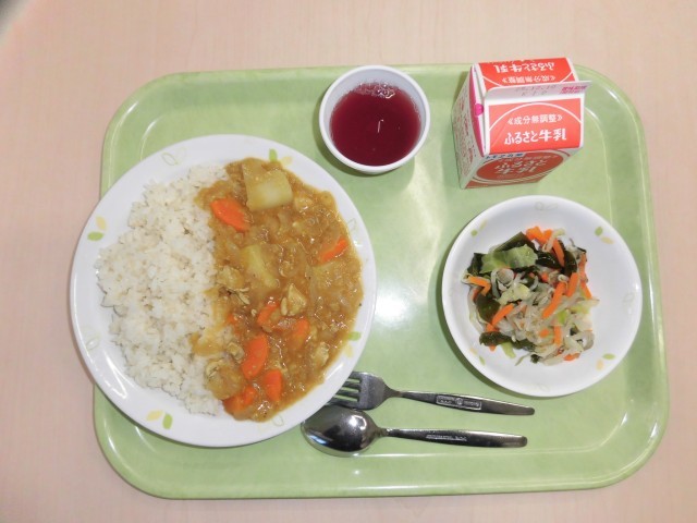 献立は、チキンカレーライス、和風サラダ、ぶどうゼリー、牛乳です。