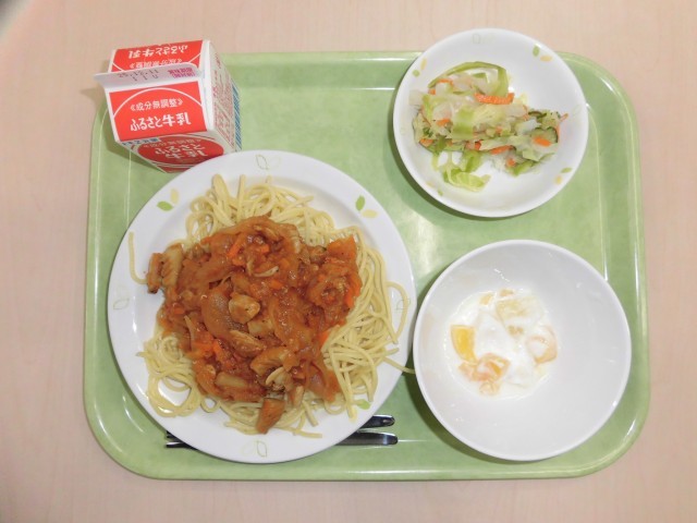 今日のこんだては、地中海スパゲッティ、フレンチサラダ、フルーツヨーグルト、牛乳です。