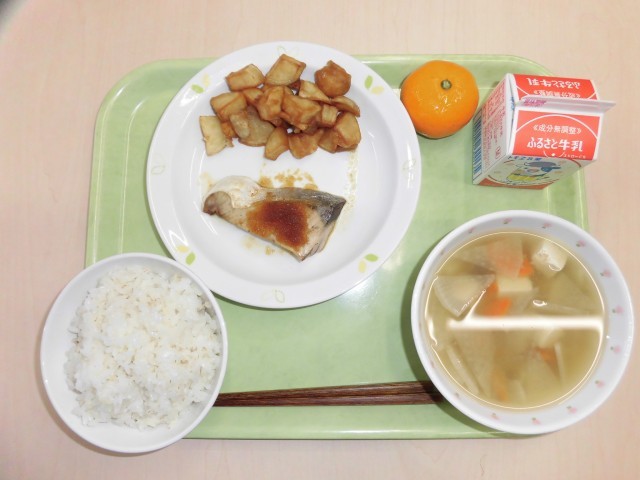 献立は、麦ごはん、魚の和風ソース、じゃがいもの揚げ煮、せたがや根菜汁、みかん、牛乳です。