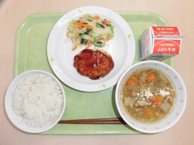 献立は、麦ごはん、豆腐入りハンバーグ、キャベツサラダ、白菜スープ、牛乳です。