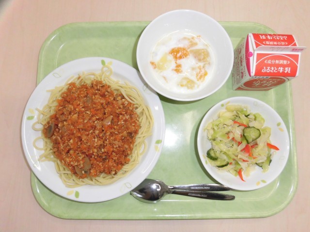 献立は、スパゲッティミートソース、イタリアンサラダ、フルーツヨーグルト、牛乳です。