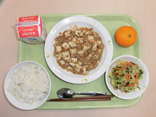 献立は、麦ごはん、麻婆豆腐、野菜の中華和え、みかん、牛乳です。