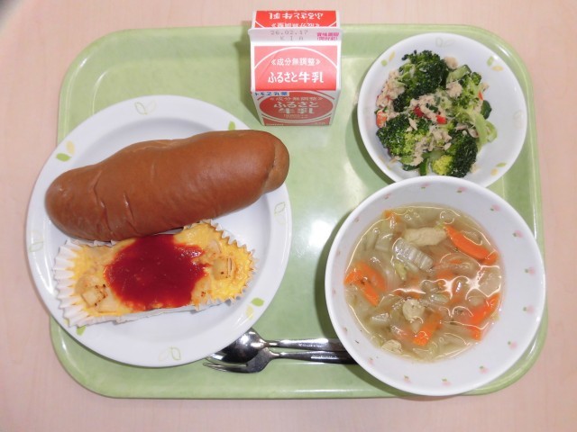 献立は、ココアパン、スペイン風オムレツ、ツナ入りブロッコリーサラダ、鶏と野菜のスープ、牛乳です。