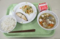 献立は、有機米ごはん、さくさくつくね、ナムル、ABCスープ、ポンカン、牛乳です。