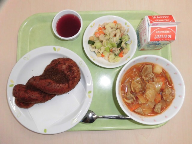 献立は、ココアあげパン、ボルシチ、ビーンズツナサラダ、ぶどうゼリー、牛乳です。