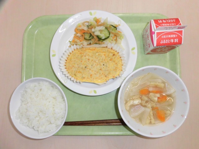 献立は、ごはん、千草焼き、パリパリサラダ、大根のみそ汁、牛乳です。