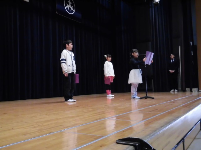 児童代表の言葉は、1年生です。今年一年頑張ったこととして、運動会のダンス、学習発表会、給食などを頑張ったことを発表しました。