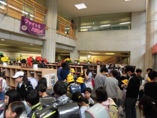 朝の昇降口です。混雑している様子ですが、6年生が1年生のお迎えをしてくれています。