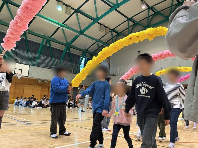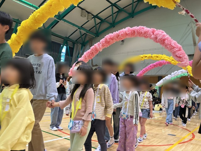 4月6日の入学式から約1週間が過ぎました。今日は1年生を迎える会です。6年生と手をつないで5年生が作った花のアーチをくぐって入場しました。