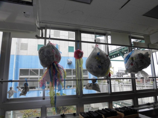 4年生は天気がよくなるように、大小様々なてるてる坊主を作って教室に飾っていました。写真は逆光でちょっと見えづらいですが、ひとつひとつ、特徴があります。