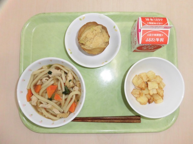 献立は、きつねうどん、じゃがいものからあげ、きなこ蒸しパン、牛乳です。