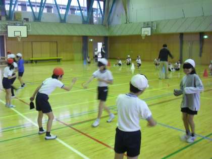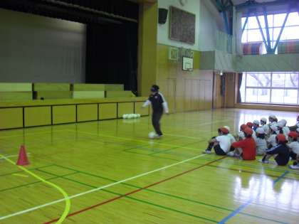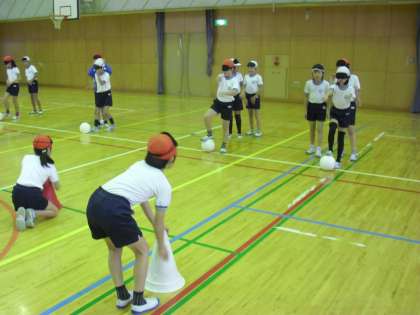 今日、4年生は、各クラス1時間ずつ、5,6時間目に総合の授業でブラインドサッカーを行いました。