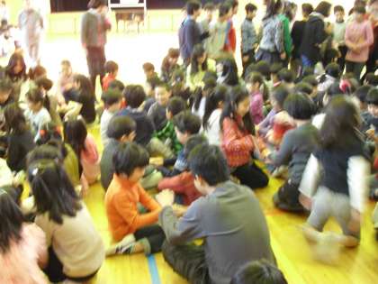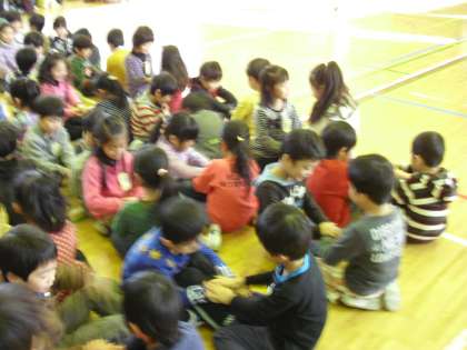 わらべうたで遊びました。歌や遊びを覚えたら、5,6年生が下の学年に混じって一緒に