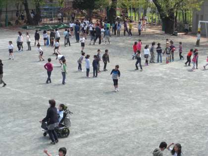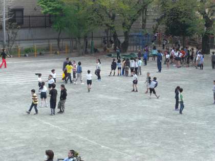 今日は、50メートル走をしました。先生たちに挑戦した子どもたちもいます。鉄棒前で走っています。