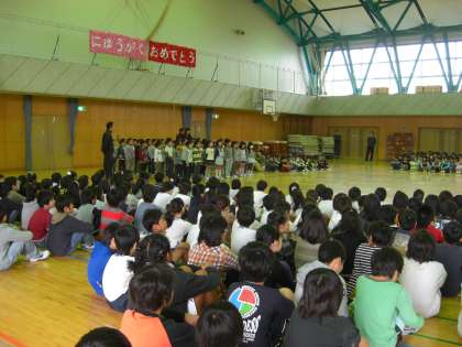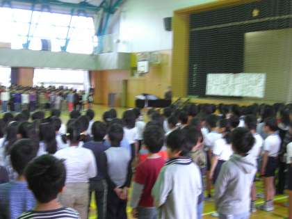 今日は、今年度第1回めの音楽朝会でした。1年生に校歌を教える音楽朝会のはずでしたが、1年生が、すでに校歌を覚えて歌うことができるようになっていましたので、1年生より大きな声で歌う音楽朝会になりました。1年生も上学年の子どもたちも上手に歌うことができていました