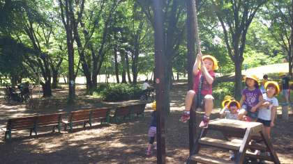 子どもたちは、アスレチックで遊んでいます。ターザンロープが大人気です。