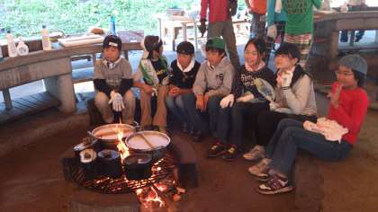 まきを燃やしてカレーとご飯を作ります。