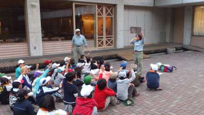 だんだん暗くなってきました。ナイトハイクの始まりです。係の方の案内のもと、夜の森へと出発です。