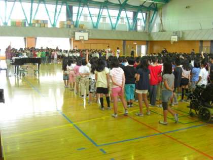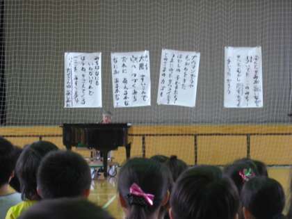 今日の音楽朝会の歌は、「あしおと」でした。最後の高い声を、高学年も、中学年も、低学年もきれいに出せました。歌詞は、歴史に思いをはせる内容です。