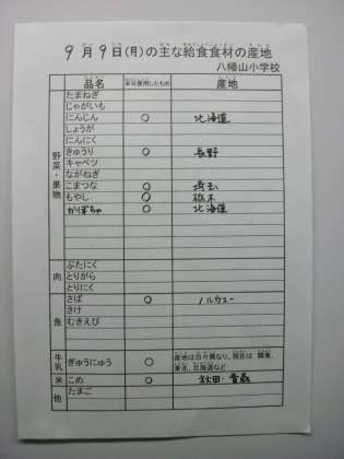 9月9日の主な給食食材の産地です。