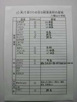 10月15日の主な給食食材の産地です。