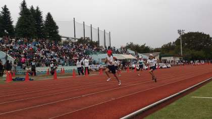 女子の100mから競技開始です。みんながんばってます。ポツポツ雨が降ってきました。