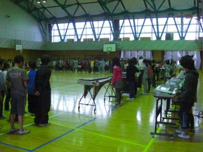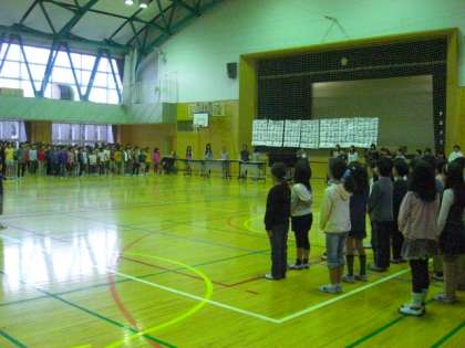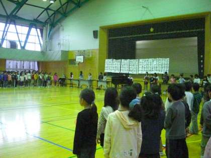 ところで、子どもたちは、8時半より前にどの学年も集まり、チャイムが鳴るのを一人としてしゃべらず待ち、チャイムと同時にさっと立つことができています。特に今日は、待っている間、外の雨の音が聞こえていました。本沢先生からほめてもらい、もう一度耳をすまして雨の音を聞いてから音楽朝会を始めました。