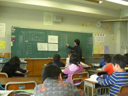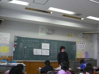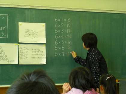 2年生は算数で、かけ算の学習をしています。写真は算数担当の菅藤先生の授業です。今は、6の段の勉強をしています。2年生も少人数授業を実施しているので、隣の学級の子どもたちと同じグループになったり、担任の先生以外の先生に教えてもらうので、新鮮です。