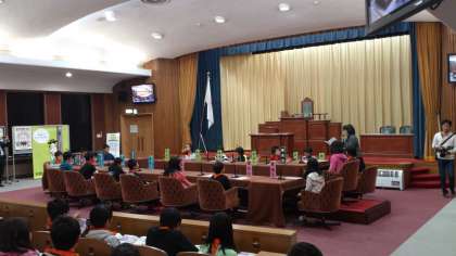 体験プログラム進行中です。裁判員裁判制度実現のための質疑を行っています。