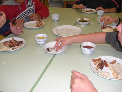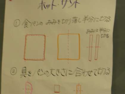 6年生は、調理実習をしました。焼きサンドと紅茶です。パンの耳は、小松先生が、あげてくれたので、砂糖をまぶして食べました。おいしいです。紅茶といっしょにみんなで食べました。