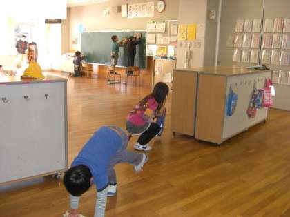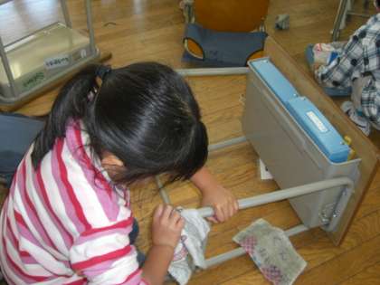 明日で2学期が終わります。今日の八幡山小学校では、授業以外にお楽しみ会や大掃除をしている姿が見られました。1年生の子どもたちは、机や椅子の足の裏もきれいにしていました。どの学級も、担任の先生が、床にワックスを塗って2学期を終わります。明日は、終業式です。