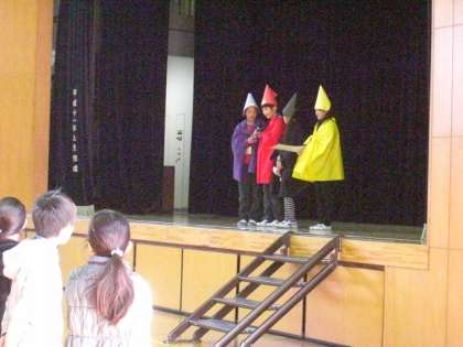 始業式の後、代表委員の子どもが、あいさつヒーローに扮して、あいさつキャンペーンについてのお知らせがありました。各学級にはられたあいさつの木にみんなで印を集めていく取り組みをします。